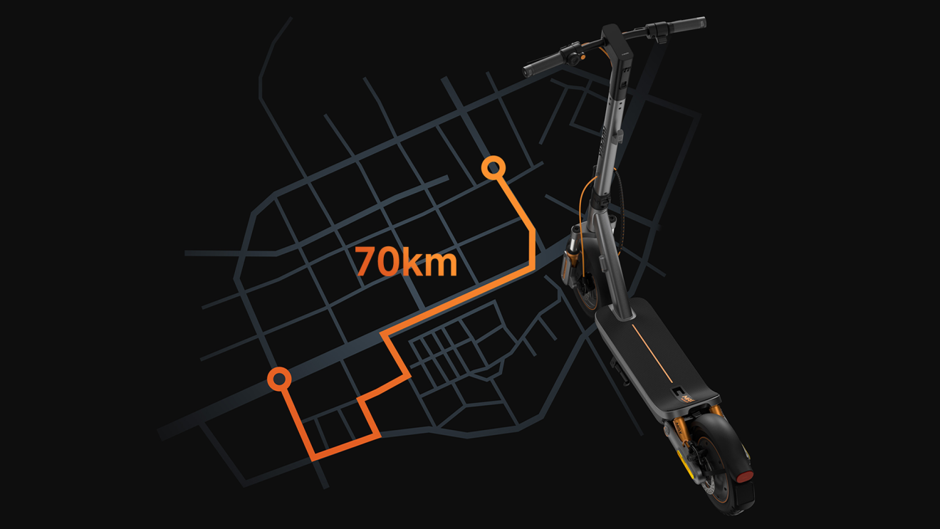 Užite si jazdu bez kompromisov vďaka predĺženému dojazdu až do 70 km. S výkonnou 468Wh lítiovou batériou dosahuje kolobežka vysoký dojazd až 45km aj v športovom režime, pri maximálnej rýchlosti (25km/h).