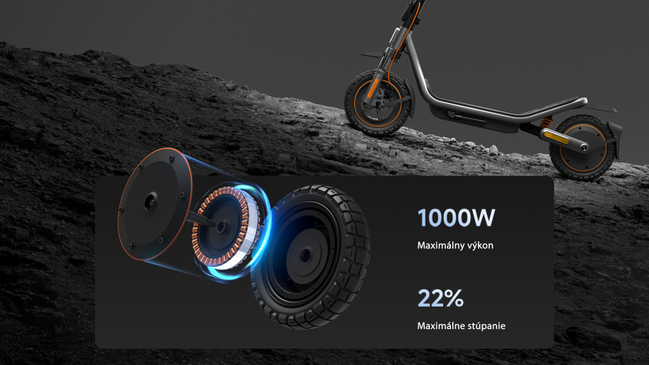 Kolobežka je vybavená bezuhlíkovým motorom s výkonom až 1000W a pohonom zadného kolesa, ktorý zabezpečuje bleskové zrýchlenie a stabilne vysoký výkon počas celej jazdy. Vďaka vysokému výkonu ponúka stúpenie až do 22%.